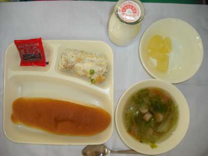 「マカロニグラタン、レタスのスープ、りんごかんづめ、コッペパン、イチゴジャム、牛乳」