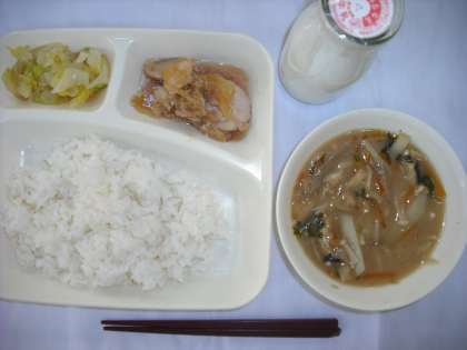 「鶏肉の甘辛焼き、みそ汁、キャベツの梅風味、ごはん、牛乳」キャベツは、今の時期は、葉の巻がゆるい「春キャベツ」、夏と秋には「高原キャベツ」、冬には「冬キャベツ」と一年中おいしく食べることができる野菜です。