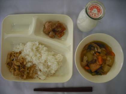 「鶏肉のてりやき、じゃがいもとあつあげの煮もの、ごまかかいため、ごはん、牛乳」