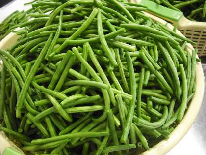 じゃがいもとあつあげの煮ものには、生の三度豆が使われています。ごまかかいためは、たけのこを使ったふりかけ献立です。