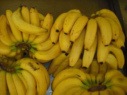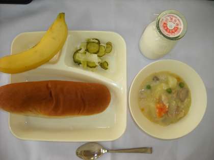 「コーンクリームシチュー、グリーンサラダ、バナナ、黒糖パン、牛乳」