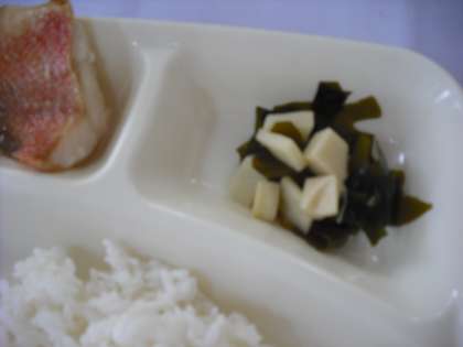 「赤魚のしょうゆだれかけ、みそ汁、わかたけ煮、ごはん、牛乳」