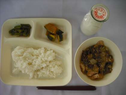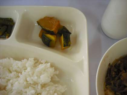 「すき焼き煮、三度豆のごま酢あえ、焼きかぼちゃの甘みつかけ、ごはん、牛乳」