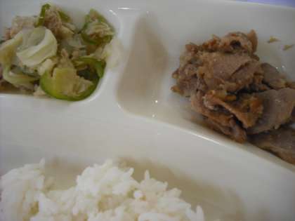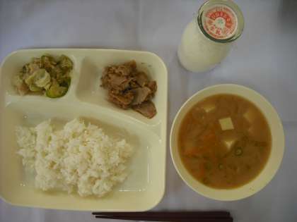「豚肉のおろしじょうゆかけ、みそ汁、野菜いため、ごはん、牛乳」