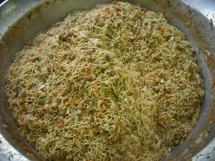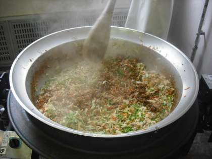 堀川小学校では焼きそばは、大釜2釜で炒めています。写真左がめんをゆがいています。真中が具を炒めています。右がめんと具をあわせて、炒めています。この釜が2つで730人分です。