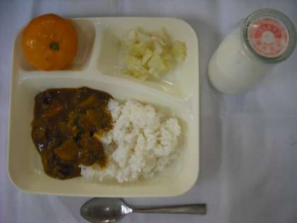 「夏野菜のカレーライス、キャベツのサラダ、冷とうみかん、牛乳」