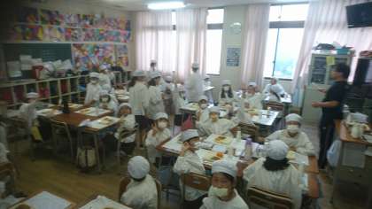 今日は、全学年で交流給食をしました。兄弟学年(1.6年生・2.5年生・3.4年生)でクラスの半分の子どもが入れ替わって給食を食べました。はじめは緊張して、かたい表情の子どもたちが多かったですが、給食が終わる頃には打ち解けて楽しそうでした。