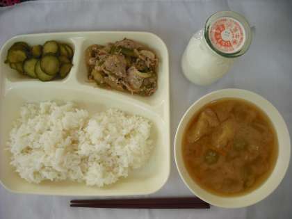 「豚肉とピーマンのしょうが焼き、とうがんのみそ汁、きゅうりのピリ辛あえ、ごはん、牛乳」でした。