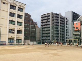 夕方、広々とした運動場で、いきいき活動の児童がボール遊びをしています。