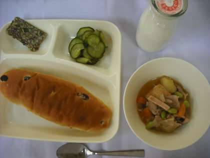 「もずく入りヒラヤーチー、豚肉といかの煮もの、あっさりきゅうり、レーズンパン、牛乳」