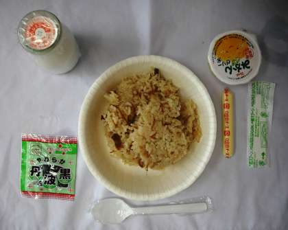 「かやくごはん、みかんゼリー、ソフト黒豆、棒チーズ、牛乳」