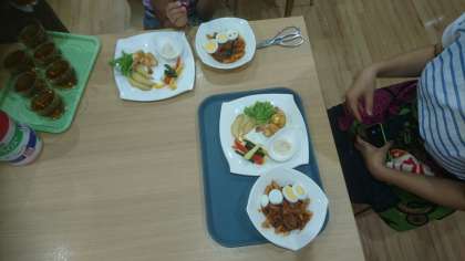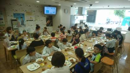 今日は、淀屋橋にあるクッキングスクールでPTA親子クッキングが行われました。メニューは「チーズinエビフライ」「カラフル野菜のグリルサラダ ツナマヨディップ付」「ナスとスマイルたまごのミートソースパスタ」「ふるふるミルクゼリー」です。完成した時には、みんな素敵な笑顔でした。