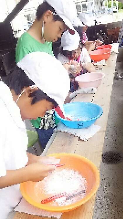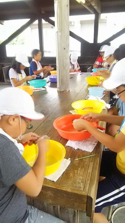 まが玉作りをしている様子です。きれいに仕上がるようにみんな一生懸命磨いています。