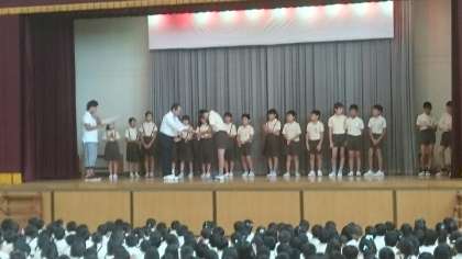 今日の全校朝会で夏休みに行われた児童水泳記録会の表彰式がありました。一人一人の記録が読み上げられ記録証が校長先生から渡されました。2学期の水泳学習は9月8日まであります。少しでも泳力を伸ばしてもらいたいものです。