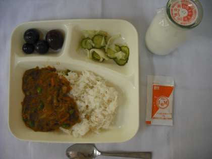今日は、アレルギーで小麦粉を食べることができない児童にも同じ給食が食べられるように米粉のカレールウを使ったドライカレーと卵アレルギーの児童も食べられるマヨネーズ風のドレッシングがついたサラダが登場しました。