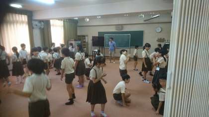 今日は4年生がマット先生に英語学習をしていただいています。体を使いながら楽しく進めていくと、いつの間にか子どもたちは英語でコミュニケーションしています。