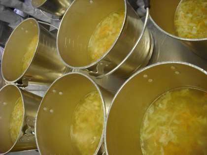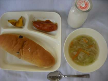 「フランクフルトのケチャップソース、スープ、焼きかぼちゃ、レーズンパン、牛乳」