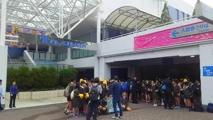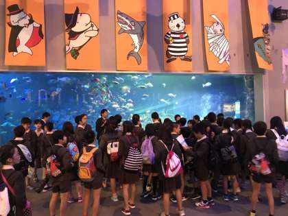 鳥羽水族館につき、班活動がスタートしています。大きな水槽の中を優雅に泳ぎ回る魚を楽しそうに見ています。