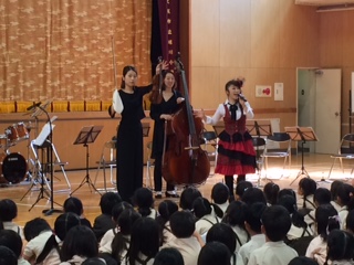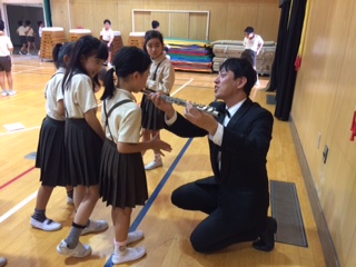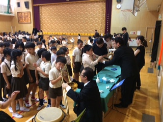 休憩時間には、楽器の体験コーナーもあり、実際に音を鳴らしてみた児童もいました。