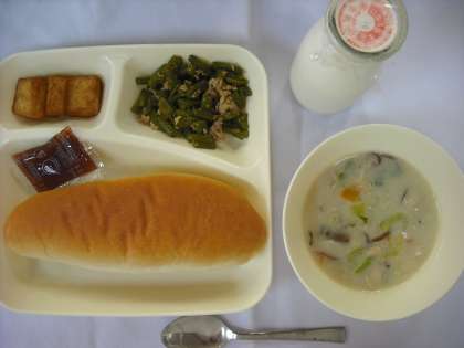 「はくさいのクリーム煮、あつあげのしょうゆだれかけ、豚肉と三度豆のいためもの、大型コッペパン、いちごジャム、牛乳」