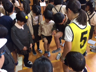 「班で輪になって手を使わずにスリッパをとなりの人にわたしていく」というのが今日のゲーム。