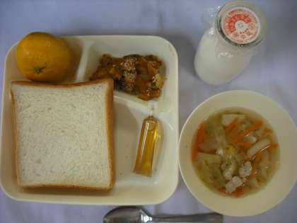 今日のみかんは、温州みかんです。給食では、一年を通して、はっさく、河内ばんかん、清見オレンジ、オレンジ、デコポンのかんきつ類が登場します。