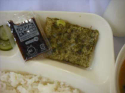 大阪の食文化を体表する食べ物としてお好み焼きが給食にも登場します。給食のお好み焼きは、四角い鉄板で焼き、切るため四角形です。見た目はお好み焼きらしくありませんが、味はお好み焼きです。別添えのソースをかけて食べます。