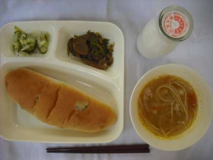 「牛肉のカレー風味焼き、トマトのスープスパゲッティ、キャベツときゅうりのピクルス、レーズンパン、牛乳」