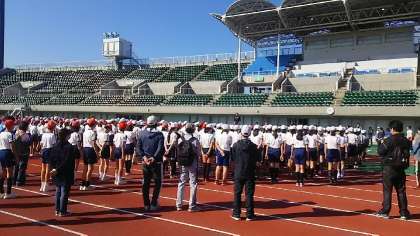 今日は6年生が長居競技場で行われるスポーツ交歓会に参加しています。100m走やドッジボールなど北区の小学校と競い合います。