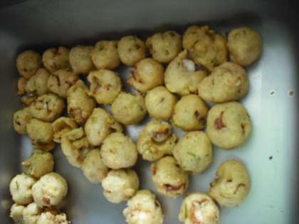 たこボールは、たこ、とうふ、小麦粉、でんぷん、かつおぶし、青ねぎ、塩を加えてまぜます。次に まとめてまるめ、油で揚げます。児童に好評の献立です。