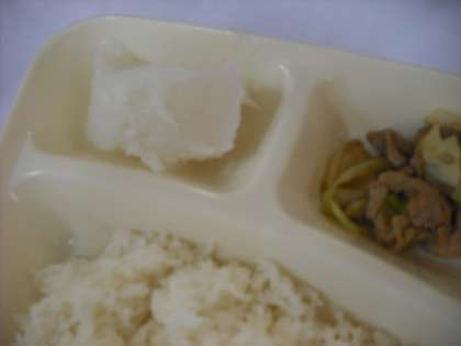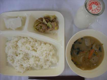 「豚肉とまいたけのいためもの、つみれ汁、ういろう、ごはん、牛乳」
