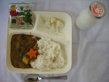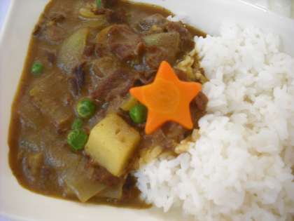 今日のビーフカレーライスには、ラッキーにんじんがクラスに1〜2個入っています。