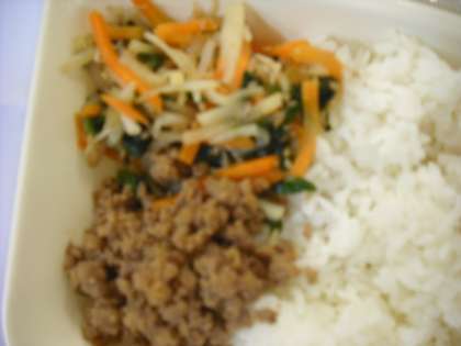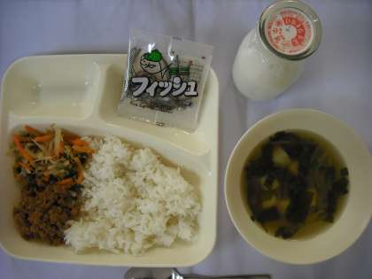 「ビビンバ、わかめスープ、ミニフィッシュ、牛乳」