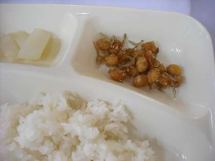 じゃこ豆は、甘辛い味つけで、大豆とちりめんじゃことごまのはごたえがよく、児童に人気がある献立です。