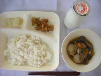 「鶏肉と野菜の煮もの、じゃこ豆、かぶのゆず風味、ごはん、牛乳」