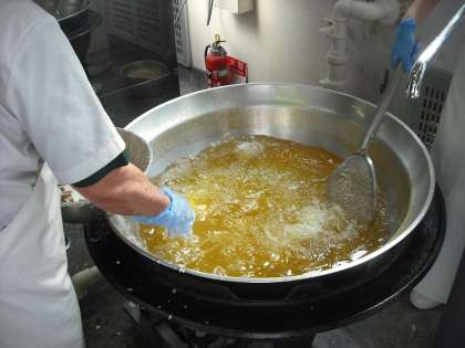 給食の「さけのマリネ」は、うすく切ったたまねぎとりんご酢、オリーブ油、白ワインでつくったマリネ液にでんぷんをまぶして油で揚げたさけをからませています。