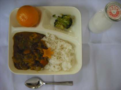 「冬野菜のカレーライス、ブロッコリーのサラダ、みかん、牛乳」