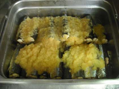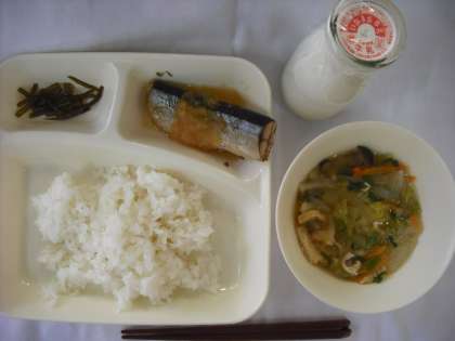 「さんまのみぞれかけ、五目汁、茎わかめのつくだ煮、ごはん、牛乳」
