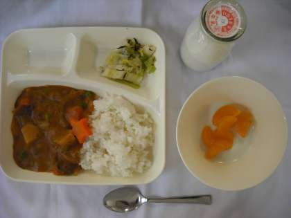 「ハヤシライス、キャベツのひじきドレッシング、みかん(缶)、牛乳」