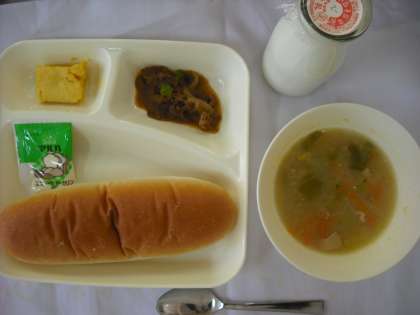 「牛肉のデミグラスソース煮、コーンスープ、かぼちゃのプリン、コッペパン、ソフトマーガリン、牛乳」