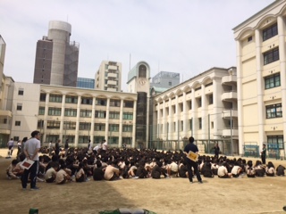 給食室から出火したという想定の訓練です。新しい教室から運動場への避難経路を確認し、「押さない」「走らない」「しゃべらない」の「お・は・し」を合言葉に、すばやく避難しました。
