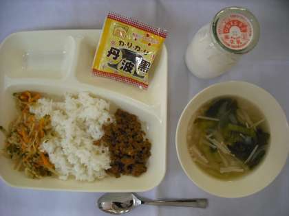 ビビンバは、肉と野菜を別々に味をつけて、配缶しています。教室で児童が配食する時も別々に配食しています。トックは、韓国・朝鮮のもちが入ったスープです。