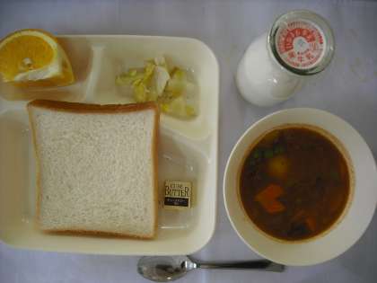 「ビーフシチュー、キャベツのピクルス、甘夏かん、食パン、バター、牛乳」
