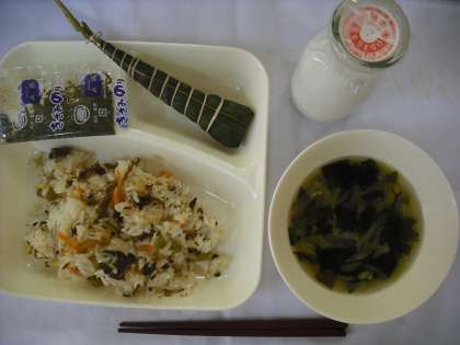 「牛肉のちらしずし、すまし汁、ちまき、牛乳」