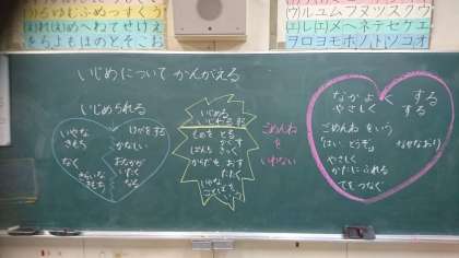 今日は「いじめについて考える日」です。各クラスで「仲間づくり」や「いじめること」について話し合ったり、考えたりしました。子どもたちは、児童朝会での校長先生からの話や担任の先生の話に耳を傾けていました