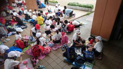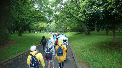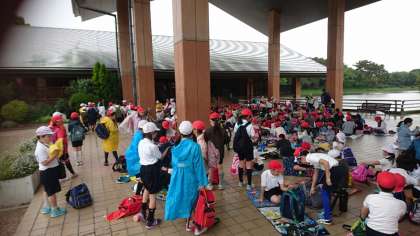 屋根のあるところで、お弁当を食べました。少し早めに学校へ帰ります。