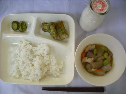 「ちくわのいそべあげ、鶏肉とさといもの煮もの、あっさりきゅうり、ごはん、牛乳」