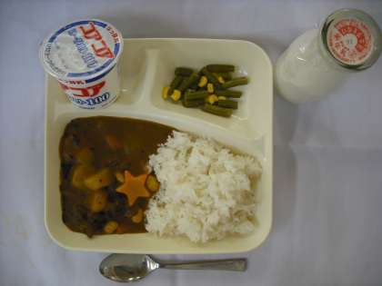 今日は、大豆を使ったカレーライスです。冷凍の大豆を使ったカレーライスです。児童に好評な献立です。