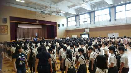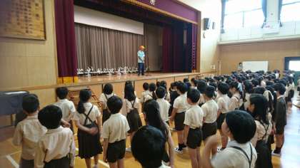 今日は、子どもたちの登下校を守ってくださっている区役所のあんまち隊の方が児童朝会に来てくださいました。全校児童に登下校の安全についてお話をしてくださいました。