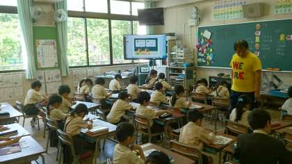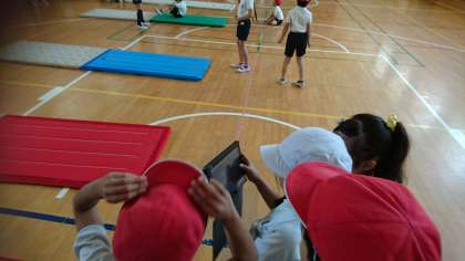 4年生は、マット運動をタブレットで撮影して自分たちの動きを確かめています。自分がうまくできていないところを気づくことができます。1年生は、大型テレビで算数の教科書を見ています。大きな画面で確かめると学習していることがよく身につきます。